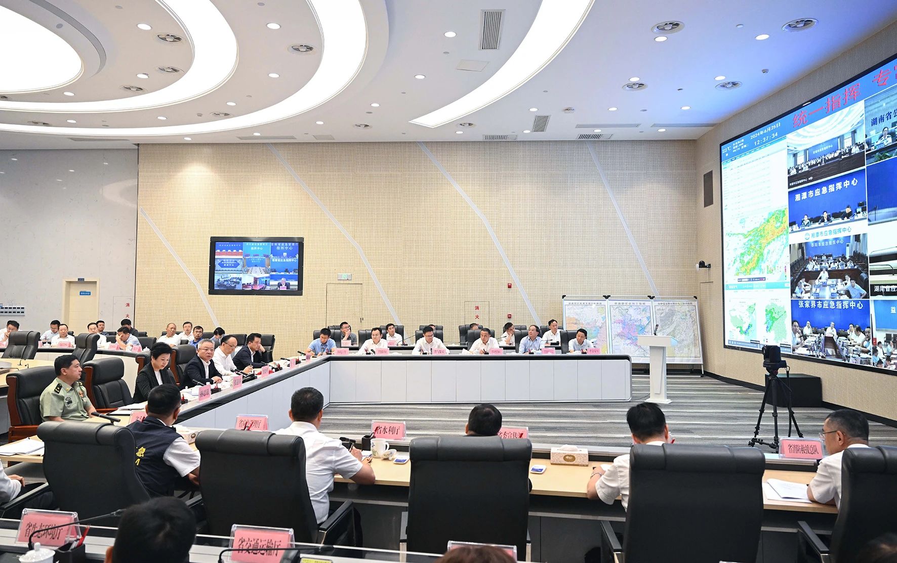 各市州設分會場,吳桂英、隋忠誠、魏建鋒、汪一光、張迎春、王宇、秦國文、李建中、王一鷗、蔣滌非、周海兵、虢正貴、孫思敬等同志出席。會上,國家防總工作組負責同志提出工作要求。相關省直部門和市縣匯報了當前雨情汛情和防汛救災工作情況。